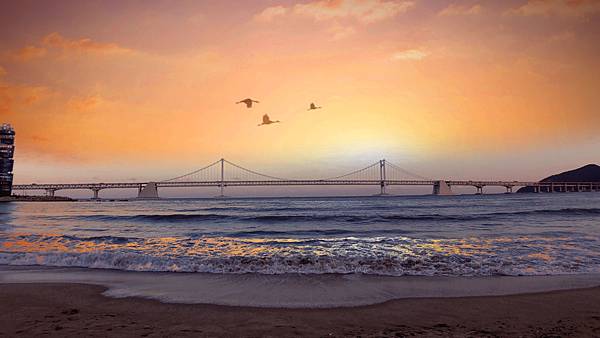 在廣安海水浴場可以看到美麗的海灘與海景,還有廣安大橋,這一景色不單單只是照片的呈現,真的要在現場才能感受到的美麗,美麗乾淨的沙灘,湛藍的海水,搭配上晚霞,真得慶幸我有來,很推薦大家來釜山必來的景點。