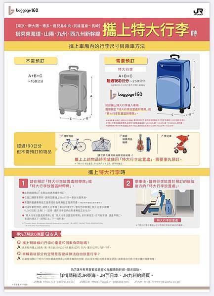 搭乘 JR新幹線列車時,若有攜帶特大行李時需進行預訂,特大行李限制為長寬高總計不得超過 160公分,基本上只要是 29吋(含)以上行李箱都需要預訂,少於的可以放在座位上方的層架上,該特大行李限制的 JR新幹線路線為東海道新幹線、山陽新幹線、九州新幹線、西九州新幹線,其他路線的新幹線目前沒有該規定。