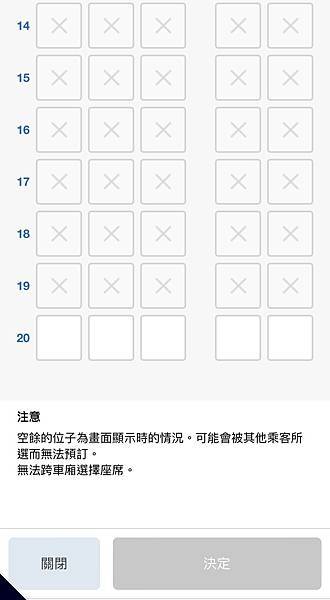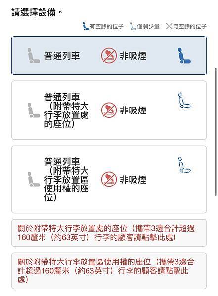 上圖的座位就是選擇 特大行李放置區使用權的座位 時會顯示的專屬座位區,為車廂的最後一排,空白部分就是還沒有人預訂,可以在指定席預訂時選擇。
