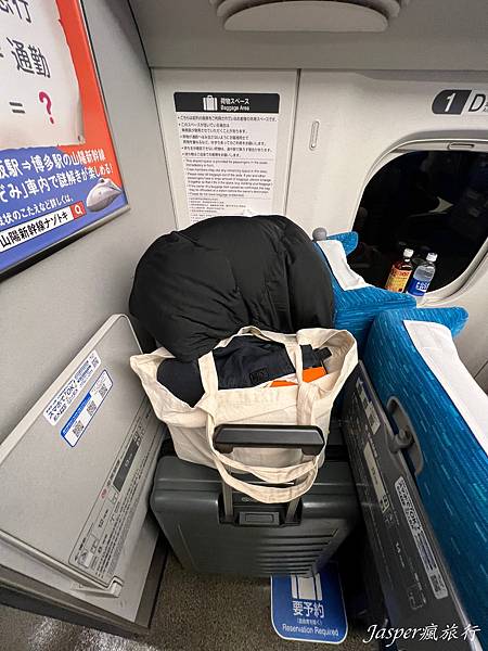 特大行李專用的指定席有分特大行李放置處的座位和特大行李放置區使用權的座位,首先特大行李放置處的座位,主要是設置部分車廂,有專門放置特大行李的區域,比如層架或平面區域,沒有預訂的不可使用,然後座位可以自己挑選,另外特大行李放置區使用權的座位,基本上就是車廂的最後一排,只要預訂該指定席座位,就可以把行李箱放置座位後方,沒有預訂該座位的也不能放置行李,這跟台灣高鐵不同,不可以看到位置就隨意放置行李,而且沒事先預訂情況下,攜帶特大行李上車,會被收取特大行李手續費 1,000日圓/件。