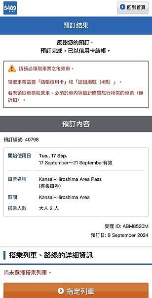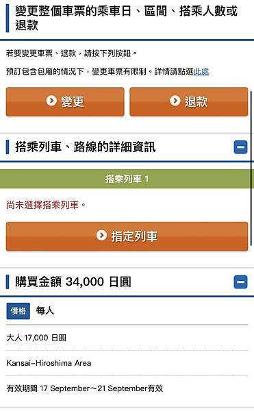 關西&廣島地區鐵路周遊券購買完成後,接著可以選擇指定席座位預約,除了特定的列車或交通工具可能需要有額外的費用,但基本上指定席預訂都不會有額外費用產生,簡單來說是免費。
